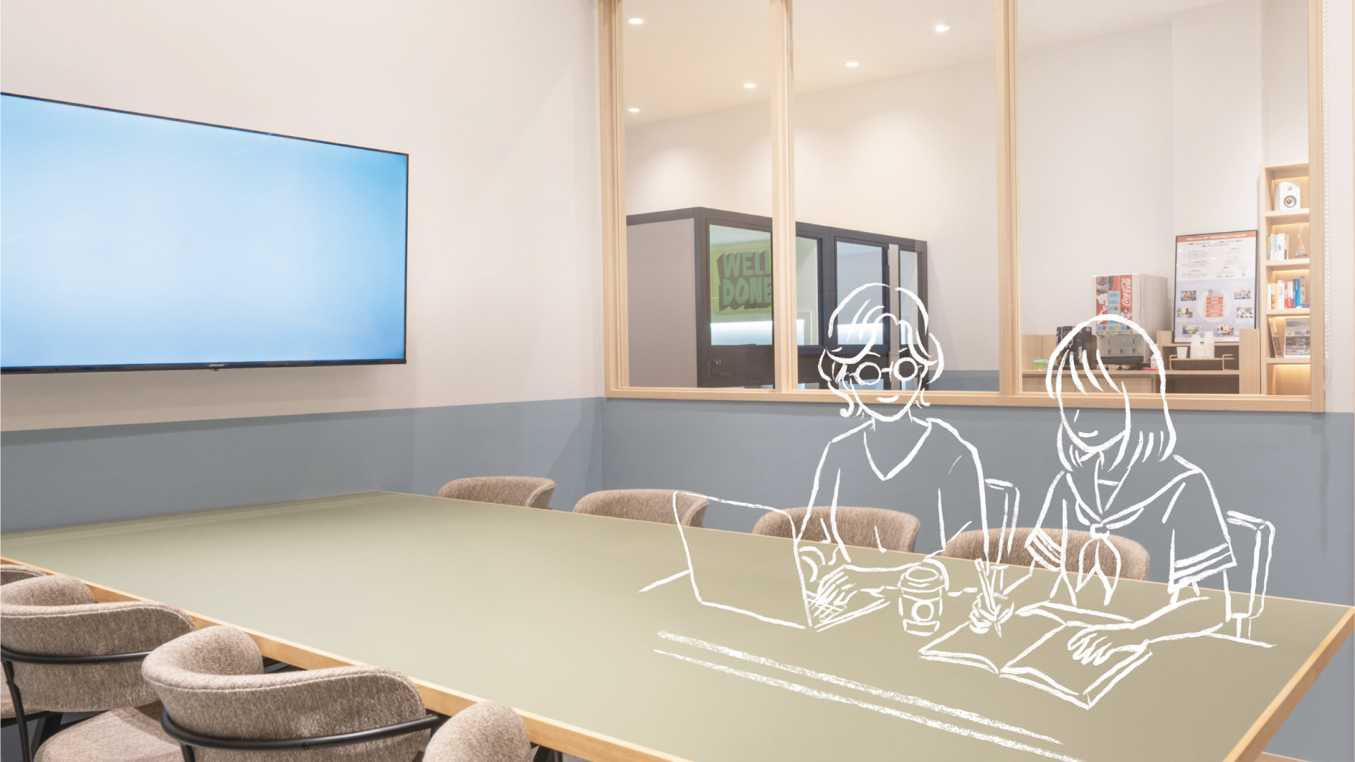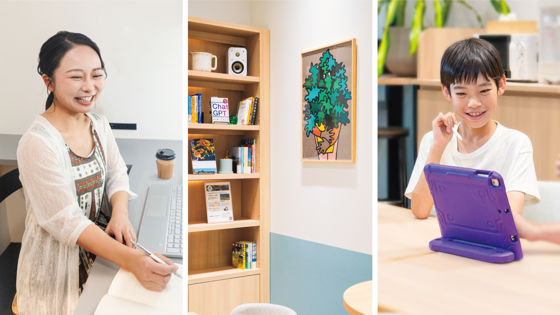 快適な設備と環境で仕事にも勉強にも集中できます。学びにつながる書籍や学習タブレットも自由に利用可能。ドコモの安心・安定の通信環境で、オンラインでの仕事も学習もスムーズに活用できます。