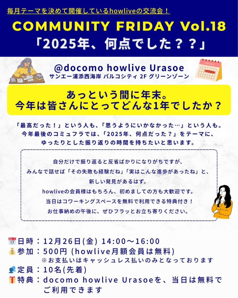 明後日、12/26(金)の午後は、docomo how live Urasoeで今年最後のCommunity Fridayを開催します☕️