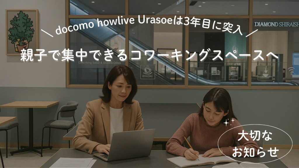 【大切なお知らせ】 docomo howlive Urasoeは3年目に突入 。 親子で集中できるコワーキングへ